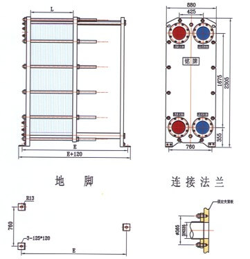 框架包括一個固定壓緊板和一個活動壓緊板,由上導(dǎo)桿與下導(dǎo)桿支承,在另‘端有一支柱。壓制成的波紋板片懸掛在兩板之間的上導(dǎo)桿上,移動活動壓緊板將板片組壓緊,再用一組夾緊螺柱將固定壓緊板和活動壓緊板夾緊至一定尺寸。兩種介質(zhì)經(jīng)固定(或活動)壓緊板上法蘭孔流入由波紋板片組成的各自通道,熱交換后介質(zhì)再由固定(或活動)壓緊板上的法蘭孔流出。同定壓緊板、活動壓緊板、支柱及導(dǎo)桿均為低碳鋼??紤]到用戶的多種使用要求,框架設(shè)計有多種型式,主要有雙支撐框架式和常用的落地式等,也可根據(jù)用戶的要求更改框架的型式。